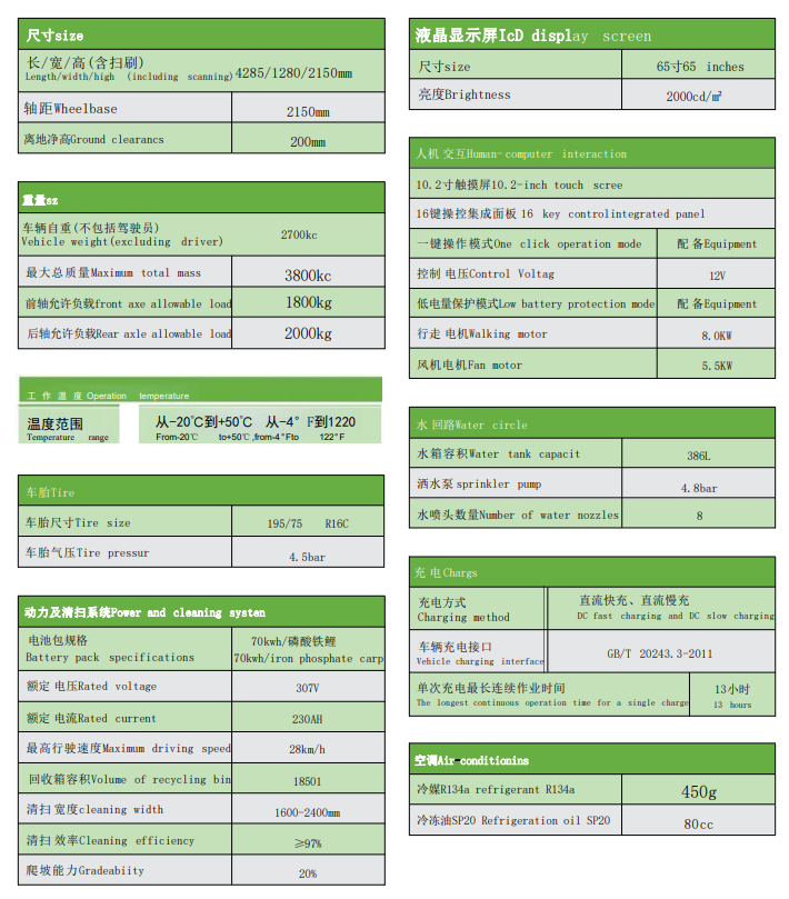 JC-DEV8240 多媒體掃路機配置有全景玻璃結構的駕駛室,舒適冷暖空調、安全警示工作燈、10.2寸超大觸摸屏、 一鍵操作按鈕、行車 和倒車雙錄高清行車儀 。70kwh 的超大容量電池組65寸大液晶顯示屏 ;掃刷轉速采用手柄式速度調節閥控制,可以根據道路實際路況控制無級調速 ;清掃掃刷位置和吸風口位置采用水霧噴淋裝置,確保在清潔過程中不會產生揚塵造成二次污染 ;該機掃刷寬度有調節功能,可由1.6米調節至2.4米,廣泛適用于城市非機動車道、城市廣場、公園、體育場館、會展中心等場所的清掃作業。
